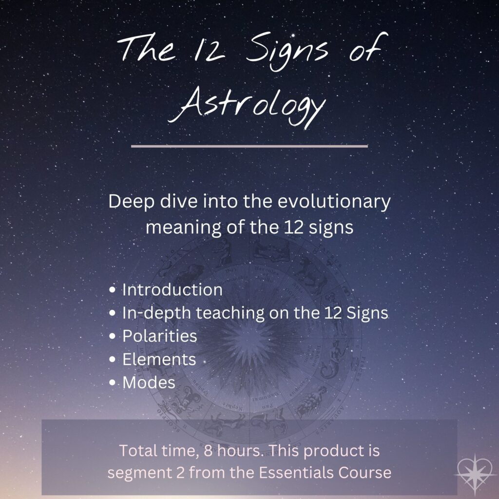 Deep dive into the 12 signs of the Zodiac. Includes polarities, elements, modes and the zodiac as a continuous flow
